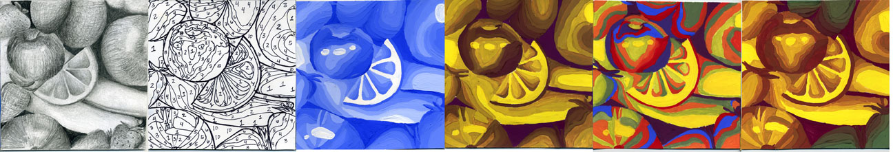 1 >value drawing 2>contour/map 3>monochromatic 4> complementary 5> color=value 6>color harmony