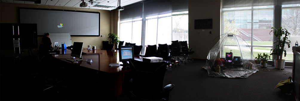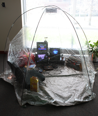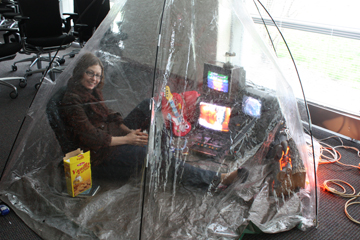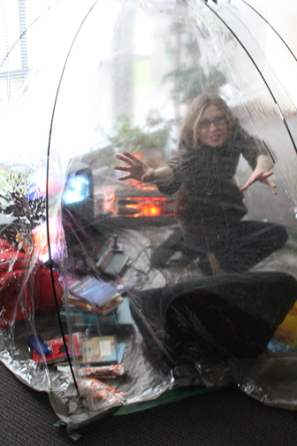 [photos] conference presenter Svitlana Matviyenko as a spontaneous performer in tent environment, broadcast to another area of the conference via Homeland Security (surveillance monitor).